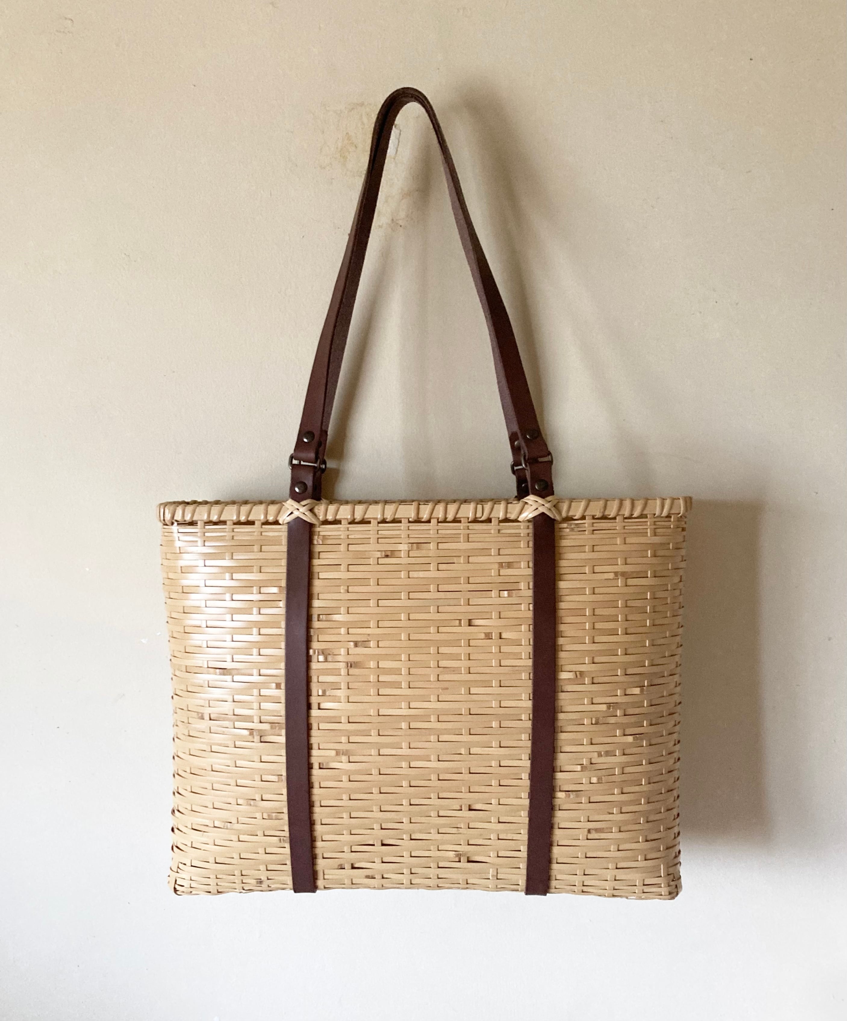 やわらかな革を、持ち手(ショルダー)に配し、上品に仕上げました。清々しくて艶のある象牙色の竹に落ち着いた焦茶色が映えます。幅(マチ)は抑え目に、しかしMacBookPro等大型のノートパソコンも楽に入る大きさです。(※実際のサイズを事前にご確認ください。)