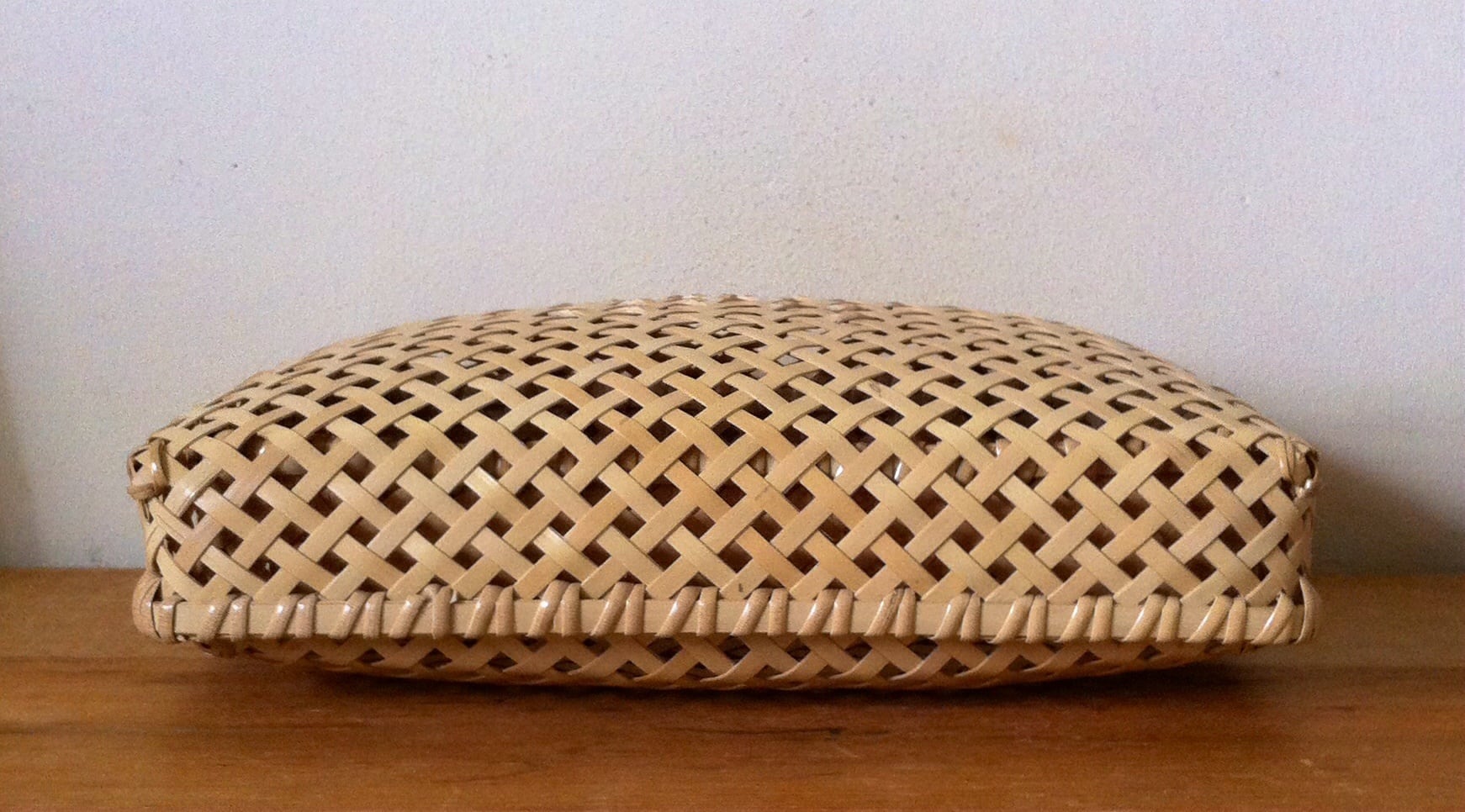 「ふたつきの箱」というのは、金属や木でつくられたものもなんとなく味がありますよね。竹で編むと“しなり”でふっくらとした優雅な曲線が形作られます。上部のフタの方はそれで良いのですが、下部のモノを入れる方はすわりが悪くなってしまいますので、「力竹(ちからだけ)」という部品をつけて平らに近くして安定させます。